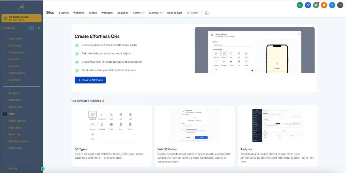 With your software, you can generate custom QR codes for just about anything in your account — funnels, booking links, forms, reviews, contact cards, and more. It’s a simple way to help customers take action fast.